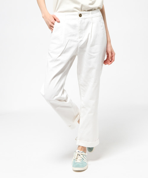 きちんと感あるツイル素材を使用したトラウザーパンツ。太ももから足首にかけて細くなるテーパードのシルエットを採用し、スタイリッシュな着こなしを実現。アンクル丈のパンツなので、靴下で遊んだり、足首を出す事でメリハリあるスタイリングが完成します。