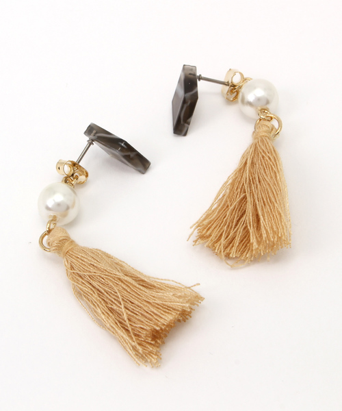 前後のギャップがユニークなタッセルとパールのコンビが珍しいピアス。動くたびに揺れるので、存在感もあり。デイリーユースでも使える個性的なデザインになっています。
