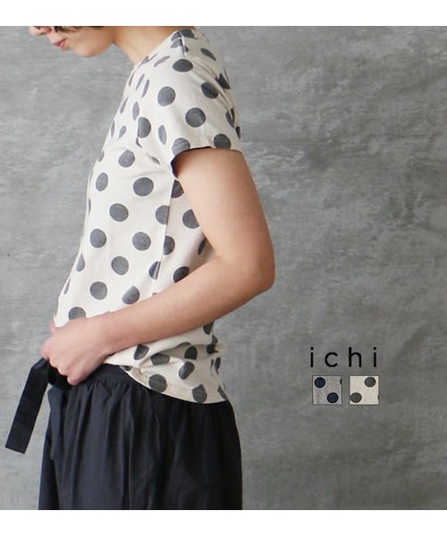 大きめドットがコーディネートのポイントになるTシャツ。 落ち着いた色合いなので、合わせやすいのもポイント。 ほどよいあき具合のネックラインで一枚でさらりと着て頂けます◎