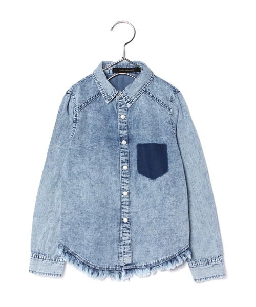 存在感バッチリのケミカルデニムシャツ☆ 今年の大トレンドでもあるフリンジ付きで、大人顔負けのデザイン性です!! あえて取れたようなポケットもアクセントとして効果を発揮!