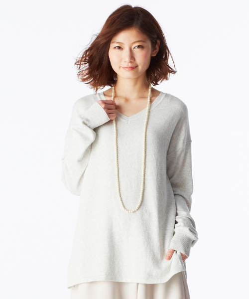 艶やかでヘルシーなヌーディーカラーのニット ゆったり、からだが泳ぐドルマンシルエットで体形をカバーする春色ニット。肌の色に近いニュアンスのカラーなので、しっとりシックにコーデをまとめます。綿のふんわり感にレーヨンの落ち感、シルクのしなやかさをプラス。薄いのにもっちり上質な肌ざわりです。 ★デザインについて★ 肌色になじむフレッシュなミントグリーン、イノセントでスタイリッシュな肌なじみのよさが魅力のホワイト、知的でクリーンな色気漂うライトヘザーグレイ、春のトレンドを意識したライトベージュをそろえました。 編地に変化をつけた衿もとがポイントに。 ★素材について★ 滑らかで肌ざわり抜群のシルク混素材を使用。さらに「二重臼(うす)」という目の詰まった編み地で、繊細ながらもっちりとしたぜいたくな質感が楽しめます。 細い二本の糸を同時に引き入れながら編む「プレーティング」という編み地で、繊細な表面感がありつつ、もっちりとしたふくらみのある生地に仕上げました。 ※手洗い可 ★Vネックニットのコーディネイト提案★ ニュアンスカラーに心やわらぐ、クリーンな春スタイルは、シルク混ニットで上質感を漂わせつつ、ラップスカート風のパンツで旬顔アピール。すらりとしたⅠラインシルエットも今っぽさの秘密です。 デニムパンツでカジュアルダウンに。ガウチョとの相性も抜群! 女っぽくしたいなら足首と手首を出してレディー度を上げればカジュアルすぎない着こなしに。 足元はパンプスやブーティを合わせることで大人っぽく、スニーカーを合わせて抜け感を出すのもおすすめ。 アウターにはコートやジャケット、ブルゾンなどを羽織りシンプルコーデに。 ストールやバッグ、アクセサリーでアクセントをつければオシャレ度up。