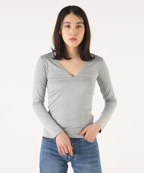 デコルテを綺麗に見せる深VネックTシャツ。 プリーツスカートにベレー帽にメガネといったちょっとしたレトロスクールガール風がおすすめ☆スカートでなければフレアーパンツに合わせてベレー帽に スカーフ使いなど小物を効かせるのも可愛い。