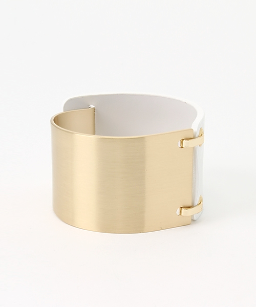 太めの幅でインパクトがあるバングル。レザーとプレートがコンビになったデザインがオシャレです。