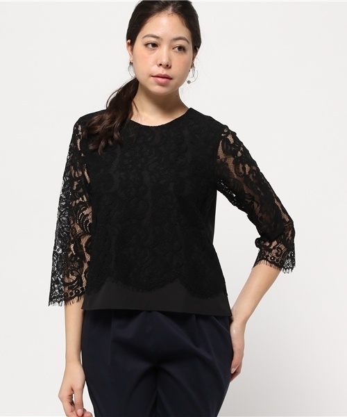 Discoat Parisien(ディスコートパリシアン) アンティーク調のラッセルレースを使用したブラウス。袖口と裾に施したスカラップが可憐なアクセントを添えています。後ろ身頃はタック入りの異素材で切り替え、メリハリと動きをプラスしました。きれいめに着こなすのはもちろん、ボーイフレンドデニムに合わせればワンランク上の外しスタイルに仕上がります。