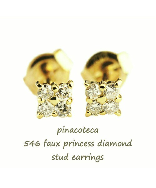「 Faux Princess 」 4石のダイヤを使用しながら一粒ダイヤピアスにみせた華奢スタッドピアス 正方形のダイヤであるプリンセスカット風のピアスは、シンプルでありながらも「四角」というクールな雰囲気と「お花」にも見える印象で女性らしさも感じられます。 一粒あたりのダイヤサイズは小さいものの、0.05ctの一粒ダイヤよりも直径がひとまわり大きく(約2.8ミリ前後)キラキラと輝くダイヤモンドはお顔周りを華やかに見せてくれます。 シンプルだからこそ普段使いにも最適な ダイヤ輝く 華奢ピアスです。 18金イエローゴールド製
