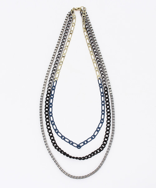 3連デザインで仕上げたチェーンネックレス。重ねづけしたインパクトあるデザインは、様々なトップスと相性よくお使い頂けます。これ一つで着用頂くのは勿論、すでにお使いのネックレスにも合わせた重ね付けもオススメ。男女問わずユニセックスでお使い頂けるので、ご自身用は勿論、プレゼントにもオススメです。