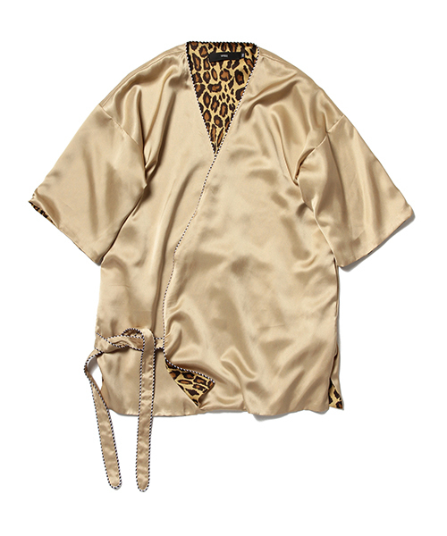 独自の解釈を加えたアイテムです。 日本の作務衣をデザインベースとしながらも、光沢のあるサテン生地やレオパード柄を取り入れることで、ファッション性の高いアイテムに仕上がりました。