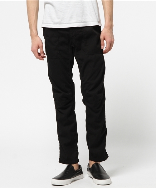 『男好みのワークパンツをアクティブな一本へとアレンジ』 サイクリストはもちろん、普段のファッションユースにもオススメしたいサイクルパンツです。シルエットは程良くゆとりのある腰回りから裾へと絞り込んだ、スタイリッシュなテーパードフィット。ワークパンツの仕様をふんだんに取り入れ、膝にダーツ、膝裏に切り替えを入れた立体的なパターンにより、膝の屈伸時にもストレスを感じさせません。またフライフロントには名門・ユニバーサル社製のジッパーを使用するなど、細部までこだわり満載です。 『汗ばんでも快適な肌触りをキープする特殊なテキスタイル』 素材は軽量で速乾性の高いポリエステルと、通気性&肌触りの良いコットンをブレンドした特殊な二重織り生地。裏面に凹凸があるため肌にまとわりつかず、サラリとしたタッチと軽やかな風合いを実感できます、さらにナチュラルストレッチも効いているので、穿き心地は実に快適。 『凝ったディテール&素材とは裏腹に、優れた汎用性も魅力』 合わせるアイテムに応じてイメージ一変。ミリタリーアウターを羽織って男っぽく、テーラードジャケットで都会的に、またカーディガンなどのニットを使えば、こなれ感のある肩肘張らない装いが完成します。そんな汎用性の高さも魅力です。