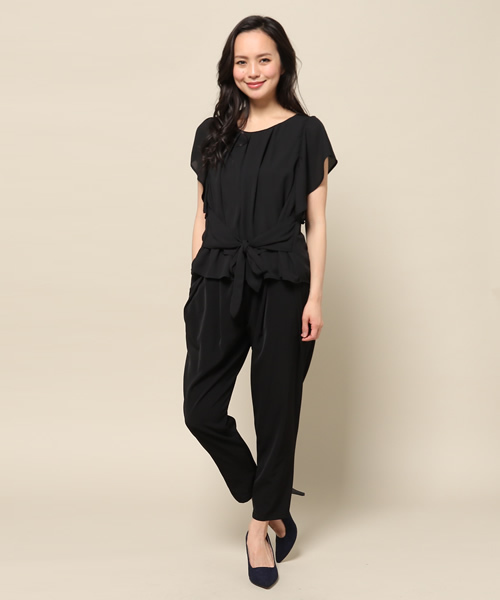 女性らしいドレープが上品なフリルセットアップ。 ウエストのリボンがアクセントながら、共布なので落ち着いた印象に仕上がっています。セットアップなので、上下別々でもお使いいただけ、プラスアイテムのコーディネートも楽しめる優秀アイテム。 結婚式や二次会など、オケージョンシーンにもお使いいただけます。