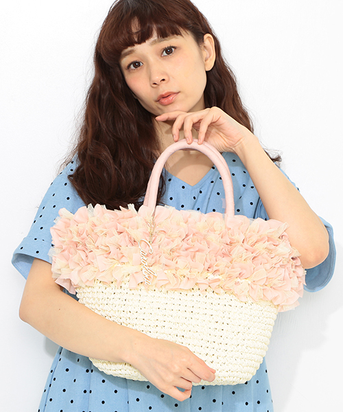 まるでブーケのようなかごバッグ。 ペーパー素材のボディにボリューミーなフリルをプラス。チュールと布帛の異素材ミックスで華やかな印象に仕上げました。 大きめサイズに内袋も付いて使いやすさも抜群☆取り外し可能なCAROLINA GLASERオリジナルブランドチャームも見逃せないポイントです。 持つだけでHAPPYなキモチにしてくれる女の子バッグ。ちょっとしたお出掛けにはもちろん、海にも花火大会にも、この夏をさらに楽しくしてくれること間違いなしです♪
