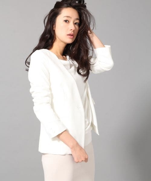 ONにもOFFにも合わせられるきれいめ素材のジャケット。ノーカラーデザインで、上品な印象。程よい着心地が魅力で、パンツスタイルにはもちろん、スカートにも◎