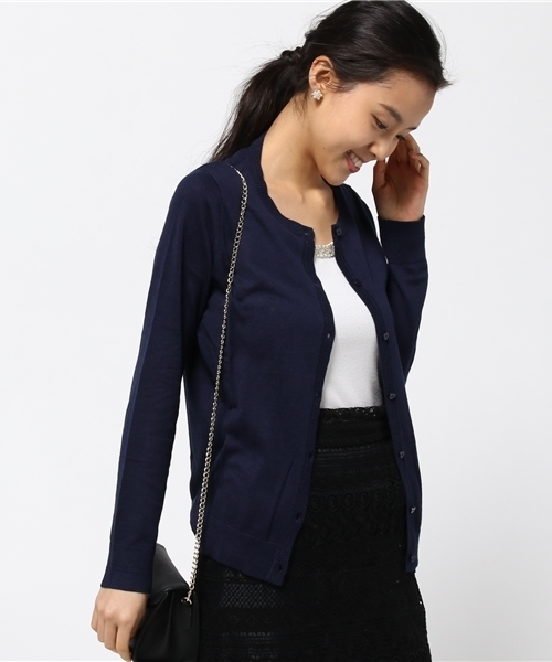 薄くて軽く春のインに活躍する定番のクルーネックカーディガン。今季はシルクを少しブレンドしているので、肌触りがとても滑らかで気持ちがいいです。ネック・前立て・裾袖口リブに編地でラインを入れ、カジュアルな表情をプラスしています。