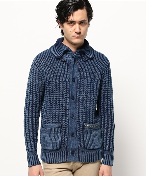 『インディゴの表情&編み柄で魅せる、専門ブランドへの別注品』 デニムの再評価にはじまり、インディゴアイテムへの支持が高まるなか、英国のインディゴニット専業ブランドである〈オリジナルブルース〉とのジョイントワークも3シーズン目に投入! 毎季ヒットを続けるその最新作では、イギリスのワークウェアを出自とするドンキージャケット型のカーディガンを提案。ボタンダウン仕様の大きなリブ衿を備え、肩の補強パッチも編み地の違いで表現しました。さらに右のポケット口には、HYSTERIC GLAMOURのアイコンでもあるスタッズワークでアクセントをプラス。 もちろん専門ブランドだからこその、長年着込んだような色落ちもこだわりのポイント。ヴィンテージデニムと同じ製法で染め上げたコットン素材なので、今後さらに味わいが深まります。またコットン100%ならではの良好な肌触りと軽やかな着心地も魅力のひとつです。 『ニットの存在感を活かす、シンプルな着こなしが基本』 特徴的なデザインに加え、インディゴ_糸の表情と手の込んだ編み柄によってカーディガン自体に存在感があるので、シンプルなコーディネイトでもしっかりと見応えのあるスタイルに。デニムはもちろん、チノやグレースラックスとも相性が良く、また春夏は爽やかで季節感のあるホワイトパンツとのコンビも間違いありません。 ORIGINAL BLUES(オリジナルブルース) スコットランドのシェトランド島にて1979年に創業し、英国伝統のハンドフレーム機によるメイド イン イングランドを一貫しているニットメーカー〈マイケル ロス〉。同社の別ラインである〈オリジナルブルース〉は、'85年よりインディゴ染めのコットン糸を使い、様々な加工を施したアイテムを発表している世界でも唯一といわれるインディゴニットを専門とするブランド。一時期、工場を閉鎖していたことで伝説的な存在となっていましたが、2013年に待望のリスタートを切り、再びの快進撃を続けています。