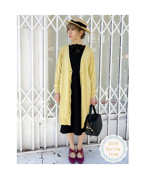ひざ下までくるロング丈で、リラックス感を楽しめるカーディガン。 金の縁取りがされたヴィンテージ感のある釦も可愛さのポイントです。 すっきりとしたVネックは、ちょっぴり大人な雰囲気。 ソフトな素材感で着心地が良く、これからの季節にさらっと羽織れるのが嬉しいところです♪ MATERIAL:レーヨン58%ナイロン42% モデル身長:150cm made in China サイズ着丈胸囲肩幅袖丈 Free89cm98cm37cm56.5cm