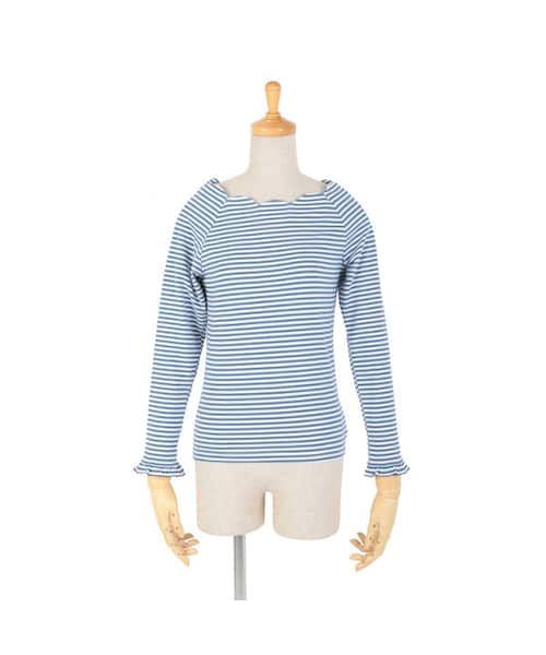 少し広めの衿ぐりに大きなスカラップが特徴的な一品。 カジュアルなボーダーにスカラップをあしらうことで女性らしさをプラス。 パンツのみならず、スカートにも合わせやすいデザインです。 ベーシックながらも主役アイテムとして一枚でさらりと着用していただけます♪ MATERIAL:コットン95%ポリウレタン5% モデル身長:150cm made in China サイズ着丈胸囲ウエスト袖丈 F56cm76cm71cm60cm