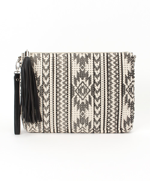 Discoat Parisien(ディスコートパリシアン) 表面に入ったスタッツ柄が特徴。クラッチの持ち手と同色のフリンジも目を引きます。取り外し可能のショルダーベルトもついていて、肩掛けもでき、内部にポケットもついているので、細かいものの整理もできて便利。細身スキニーに高めヒールを合わせてクラッチバッグを持てば大人かっこいいカジュアル完成です。