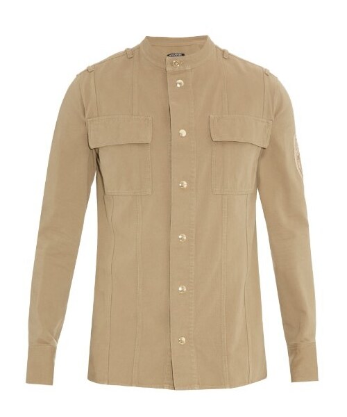 This beige cotton-twill Balmain shirt will make a sleek addition to an off-duty wardrobe. It's styled with a stand collar and two flapped-chest pockets for a cool safari vibe and finished with an embroidered dragon crest on the left sleeve. It's a loose-fitting style that runs true to size.