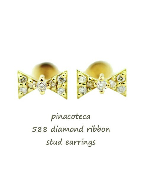 キュートな形のリボンモチーフ 小さめダイアが集まって出来ているのでキラキラと輝きます。 センターのダイヤは少し上に飛び出しているのがアクセントになっています。 ダイヤの輝きで可愛らしさの中にもフェミニン要素も詰まった華奢ピアスです。 18金イエローゴールド製