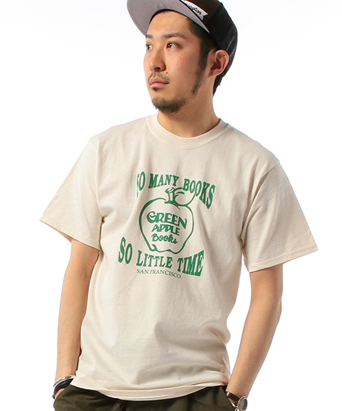 西海岸を象徴するアイコンに注目。 アメリカ西海岸ベイエリアにおいて最高の知名度を誇る書店、GREEN APPLE BOOKSのロゴプリントTシャツ。生成りがかったボディーに少しゆったり目のシルエットがリラックスした雰囲気を演出。西海岸のアイコンをプリントしたトップスはスケート、ストリート風、アメカジ、のスタイリングには欠かせないアイテムです。 GREEN APPLE BOOKS / グリーンアップルブックス。 GREEN APPLE BOOKS (グリーンアップルブックス)は1967年にサンフランシスコ、リッチモンドで開店した、ベイエリアNO.1の独立系書店。増改築を重ねた歴史を感じさせる店内には、膨大な量の本やレコード、CD、DVDなどが几帳面に整理整頓されており、探し物がすぐに見つかる優秀な書店。青リンゴのロゴがアイコン。