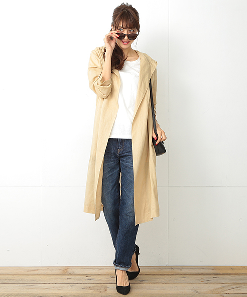 ◆16SSも気になる“ロング丈”アウター◆ 薄手のリネンで仕上げたフード付きガウン。程よい透け感がある見た目にも涼しげな1枚です。 いつものコーデにプラスするだけで、Iラインが強調されてスタイルアップ効果も。ショートボトムスを履いても、気になる後ろ脚をカバーしてくれます。 1枚持っていると、日焼け対策や冷房対策にも使える便利なアイテム。リゾートスタイルにも取り入れたい、この春一押しのアウターです。
