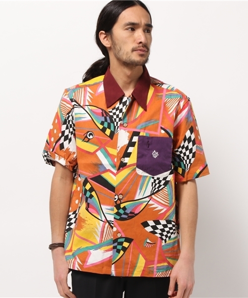 オリジナルグラフィックを贅沢にも7色使いプリントしたストレッチ素材で仕立てたシャツ。襟と胸ポケットを異素材で切り替えアクセントにしています。。同シリーズのショートパンツとクロップドパンツと合わせてセットアップでの着用も可能です。※柄の出方はアソートとなります。