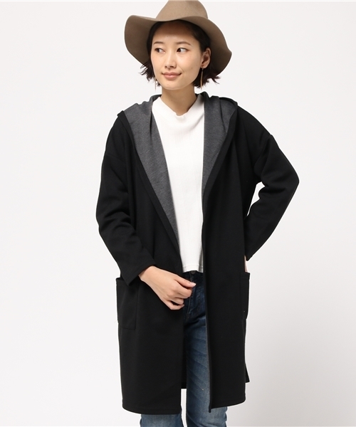 どちらの面も表に見えるダブルフェイスのしっかりとした生地を使ったカーディガン!フロントからフードに流れるゆるやかなドレープは、さらっと羽織るだけでこなれムードが出ます!ダブルフェイスの生地を活かした配色もメリハリ抜群!!肌寒い季節にも大活躍しますよ☆