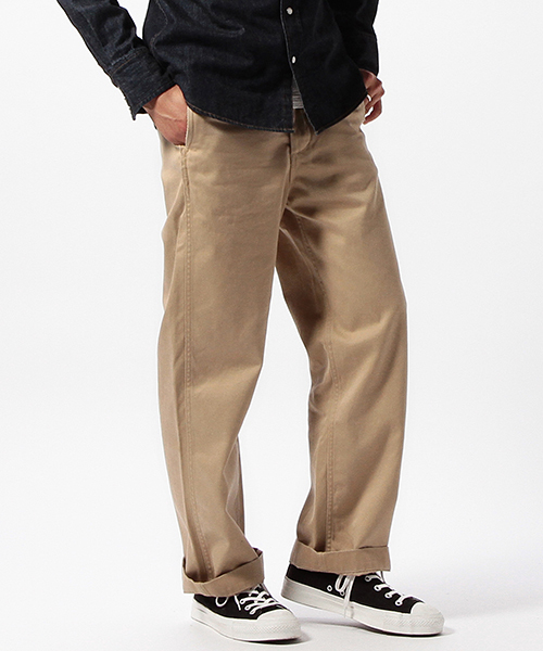 ミリタリーの要素を詰め込んだワイドチノ 1942年モデルのミリタリーパンツをベースにした、ワイドシルエットのチノ。 両玉縁のポケットやメタルボタンなど随所に拘りが詰まった、カジュアルコーディネートに役立つ無骨な1本に仕上がっています。 ワイドシルエットは今年も注目度が高く、ファッション要素の強いアイテムとの合わせもおすすめです。 ※画像の商品はサンプルです。実際の商品と仕様、加工、サイズが若干異なる場合がございます。 ※フロントのトップボタンはメタルボタンに変更になります。 ※店舗入荷のタイミングと異なる場合がございます。 予めご了承の程お願いいたします。 FIT YOUR LIFE 特集はこちら