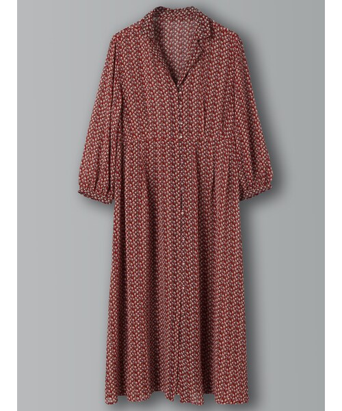 繊細な小花柄が目を惹くガウンタイプのワンピース。開襟衿がレトロな雰囲気を漂わせます。柔らかいシフォン素材を使用しているので、ロング丈でも軽い仕上がりです。フロントを開けてレイヤードした羽織としての着こなしをおすすめします。おすすめアイテム⇒インナーを着てワンピースの場合/ベルト、ロングカーディガンガウンの場合/Tシャツ、デニムボトム、ガウチョ、バギーパンツ
