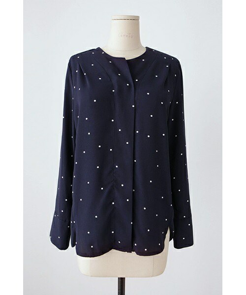 小さ目なドットがキュートな ブラウスをご紹介いたします。 首元はノーカラーになっており、 フェミニン&上品な印象です。 ボタンは隠しボタンになっているので、 スッキリと着こなせますよ♪ デニムやスキニーと、 さらっと合わせるとオシャレですね★ ◆COLOR : ネイビー ◆SIZE : FREE ◆モデル着用SIZE : ネイビー/FREE