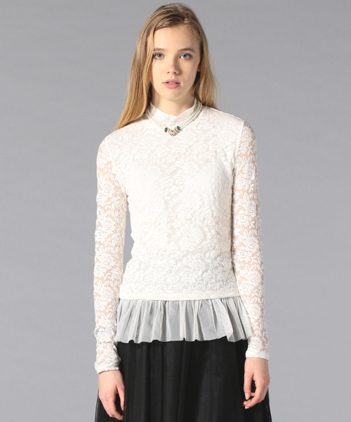 ロマンティックなイメージでインナーとしても大活躍間違い無しの、総レースのハイネックプルオーバー。繊細なレース使いと、裾に施されたプリーツが、上品でエレガントな印象を与える一着。 身頃部分は素材を二重にしており、肌側をジャージー素材にすることで、着用時の肌触りの良さと透けにくさを両立させた、こだわりの仕様になっています。 ジャケットのインナーとしても使いやすく、合わせるボトムによってオンにもオフにも対応出来るので、デイリーからパーティー、オケージョンまで、幅広いシーンで大活躍間違いなしのアイテムです!