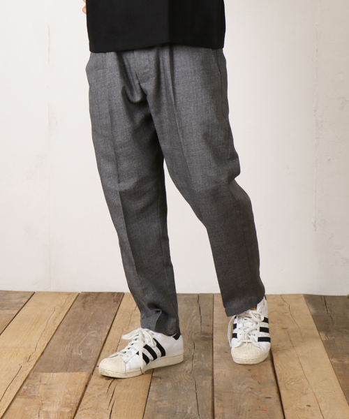 【Ciaopanic】P/Lキャンバスアンクルカットイージーパンツ素材はリネン55% ポリエステル45%の混紡糸を使用したキャンバス素材です!!麻は吸収性に優れておりポリエステルは速乾性優れています。DRYタッチ素材でありまたシワが付きにくく綺麗なシルエットが出せます。ワンタック入りでヒップ周りにゆとりをとりワタリからテーパードラインのアンクルカット丈のイージーパンツはヘビーローテーションで活躍間違いないパンツです!!