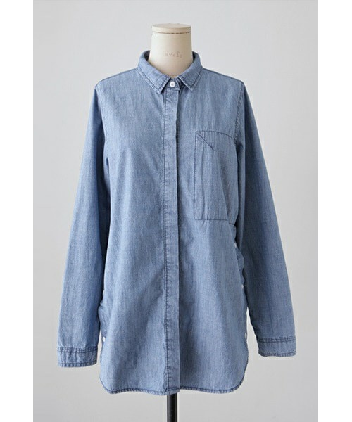 カジュアルな雰囲気漂う デニム風ブラウスをご紹介いたします。 サイドにスリットが入っていて、 ボタンで留めるデザインが個性的♪ シンプルながらもちょっとひねりの利いたデザイン。 左胸のポケット風ステッチもオシャレ★ 長め丈なので、デニムやスキニーと さらっと合わせるのにピッタリですね! ◆COLOR : ブルー ◆SIZE : FREE ◆モデル着用SIZE : ブルー/FREE