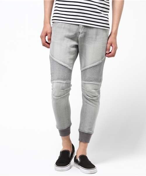 バイクのライディングパンツの様な佇まいのバイカーデニム!定番のデニムパンツに、ハードな男らしさが加わった今季マストなアイテムです。スウェットのような裾リブ仕様はスニーカーなどとも相性抜群!シャープですっきり穿けるデザインですよ☆