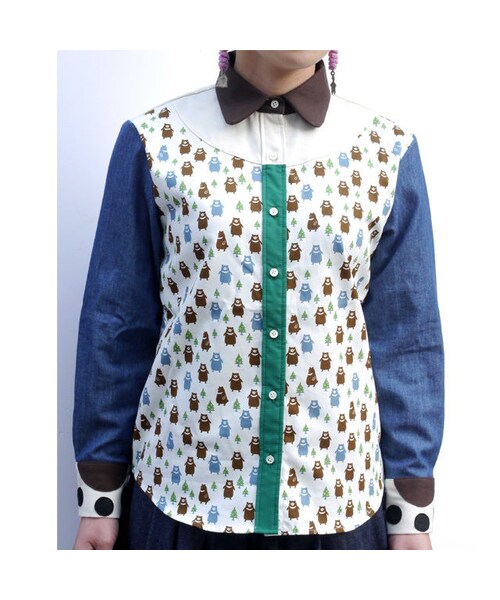 ◆モデルは、サイズXSを着用 (身長:160cm ) ◆サイズ XS 着丈63.5cm身幅52cm肩幅38cm袖丈55cm ◆サイズ S 着丈69cm身幅51cm肩幅42cm袖丈59cm ◆サイズ M 着丈69cm身幅53cm肩幅42cm袖丈59cm ◆サイズ L 着丈74cm身幅56cm肩幅43.5cm袖丈62cm ◆混率 綿100% 【MADE IN NIPPON】 担当縫製職人:Mikami.Ryoko (再生産の場合は、担当職人が変更になる場合がございます) ◆商品説明 ポップな熊の柄をメインに切り替えられており袖もとに肉球がデザインされたシャツです。 これからの季節に1枚で着用した時も十分な個性を発揮してくれます。 あなたが手を伸ばした瞬間に注目が集まる事間違いなしの一枚です。 ※お直し、他のサイズご希望の方、SOLD OUT商品のお問合せについて※ http://nirameco.net/items/548d09fa86b188d138002f3c