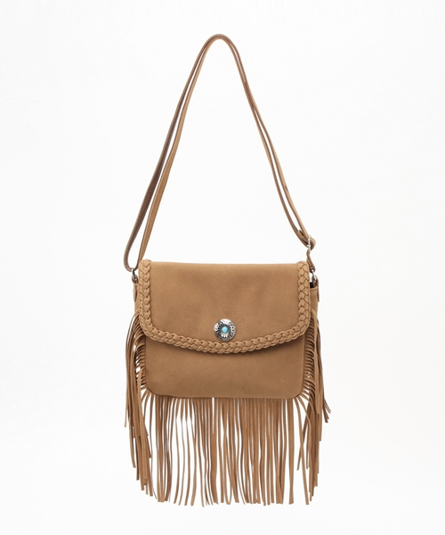 今シーズンのブランドテーマ、“ROMANTIC SEVENTIES”をイメージさせる、フリンジショルダーバッグ。 たっぷりと施されたフリンジと、ネイティブなコンチョ釦がトレンド感満載のアイテム。 コーディネートのアクセントにぴったりです。 ショルダーはスタイルに合わせて長さを変えられるのも嬉しいポイント。 ヴィンテージのような雰囲気を醸し出す、ベージュとブラウンの2色でご用意しております。