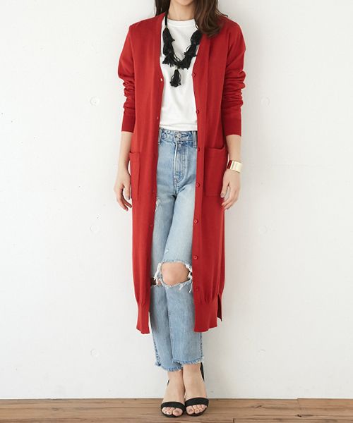 裾のサイドスリットがポイントのカーディガンは、ベーシックなシルエットで何にでも合わせやすいです♪