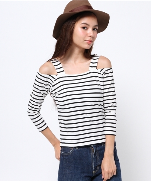 今季トレンドの程よい肌見せで女らしさのあるフィットめのオープンショルダートップス。タイトミディースカートやタックテーパードに合わせるスタイリングがオススメです。