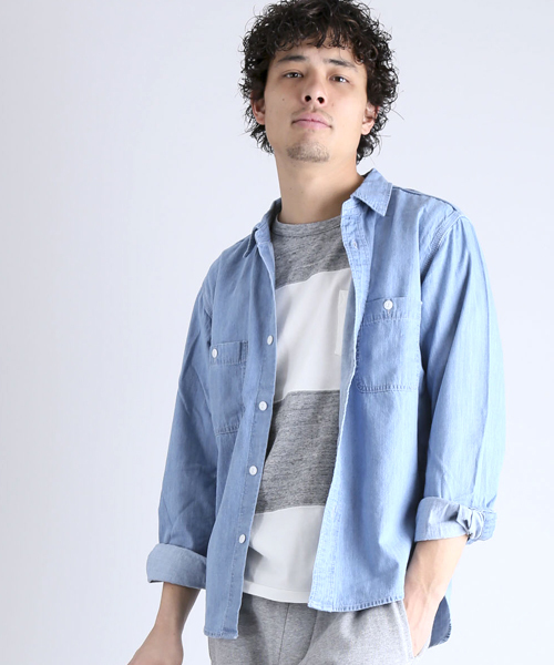 ロングシーズン使える、 ワークテイストのダンガリーシャツが登場!! さらっと着やすく風合いの良い ダンガリー素材を使用したレギュラーカラーシャツ。 ワークテイストに仕立てたディテールがヴィンテージライクな1枚。 コーディネイトしやすいベーシックなザインなので、 ロングシーズンお使い頂けるのも嬉しいポイントです。 着込むことでダンガリー生地ならではの風合いをお楽しみ頂けます。 ワークテイストなスタイリングにはもちろん、 ボトムにはトラウザーやスウェットパンツなどのアイテムを合わせるのも、 今期ぽくスタイリングをお楽しみ頂けます。