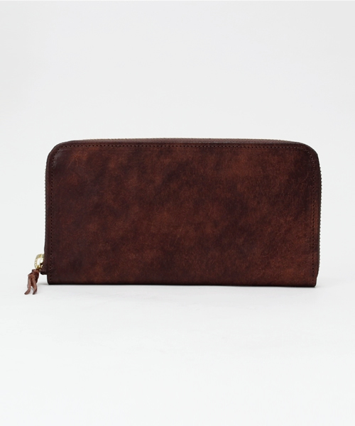 Sac’s Bar限定、イタリアのバダラッシー・カルロ社製のプエブロレザーを使用したシリーズ。 化学薬品ではなく植物タンニンを用い、時間をかけてなめされた革に牛脚油でさらにゆっくりと手間暇をかけて加脂していく伝統的な製法で作られたのがプエブロレザーです。 表面が起毛がかった風合いが特徴で、この起毛革(ヌバックレザー)は使えば使い込むほどに色が濃くなり、艶が増し、革味が良くなります。 定番型のラウンドウォレットは内装中央部にコインケース、その他にカード収納が12枚、札入れも4箇所あり収納力が非常に優れたモデル。 また日本製で職人が一つ一つ丁寧に仕上げており、綺麗で丈夫な縫製、風合いとなっております。 長くご愛用頂ける一品。