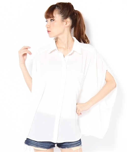 透け感のあるシフォンで女らしく仕上がるこちらのシャツ。袖に大きくスリットが入ったポンチョフォルムが差が出るポイント☆体型を気にせずに着られるから着心地もラクチン♪ model:H165 B78 W56 H83 着用サイズ:FREE