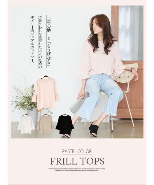 【袖フリルトップス】ベーシックだけどディティールに拘りのあるタイプで、オフィスにも普段使いにも毎日着られるベーシックを追及しお手頃価格でお届けします。袖のドレープ感が動きのあるシルエットに。