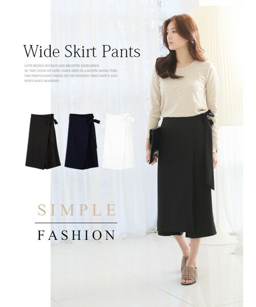 【ワイドラップパンツ】大人っぽいワイドシルエットが魅力的なラップパンツ。シルエットや素材にも今年らしさを取り入れた上品なアシンメトリーのラップパンツ。ハリのある素材が引き出す程良いボリューム感はコーディネートのアクセントにピッタリ◎