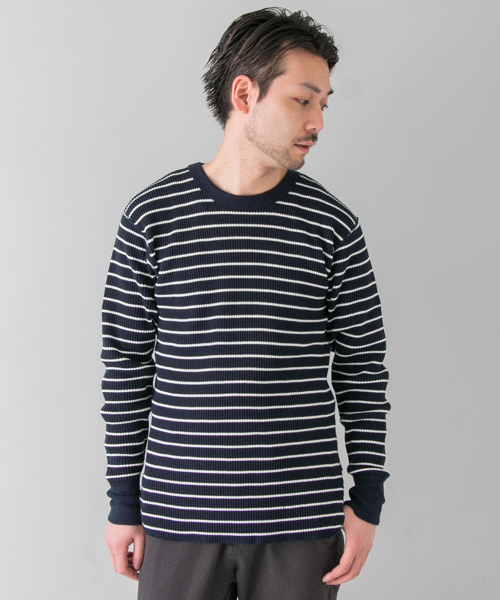 【MADE IN JAPAN ITEM】 肌触りの良いベビーワッフル生地のロング丈カットソー。 一般的な天竺のTシャツと、ニットの中間ぐらいの肉感で、肌寒さの残る一日にも快適に使えます。 裾をラウンドカットし、着丈は長く、ナローシルエットなデザインが、レイヤードスタイルに最適。 袖を通せば日本製ならではの高いクオリティーを感じられます。