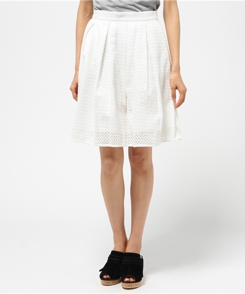 レース柄に拘りを加えたスカート フェミニンな印象の強いレース生地をスクエア柄にすることで、甘さを軽減しました。ハリ感のある生地を使用しウエスト周りにはタックを施し美しいフレアシルエットを表現。合わせる色を同トーンにし、ワントーンコーディネートにすれば普遍のテクニックスタイルに!
