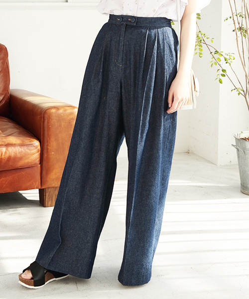今シーズンも人気のワイドパンツはおさえておきたいアイテムの1つ。 ベーシックな無地とシーズンにピッタリのストライプにデニムとシーンによって選べるデザインでご用意。 ウエストの2つ釦はシンプルながらインスタイルの際ポイントに。 ウエストゴムでもスッキリとしたサイズ感でオススメの1枚です。