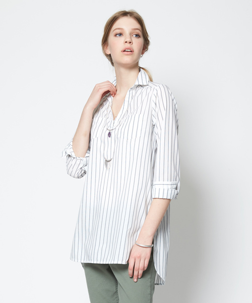 洗練された大人カジュアルスタイルに仕上がるスキッパーシャツ。 無地のオフホワイトとストライプの2パターン展開。 ゆったりシルエットが体型カバーにも。 デコルテを美しく魅せるVラインもポイントです。