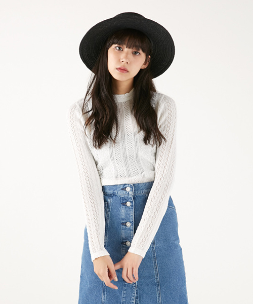 春に向けて使えるレーシーなニットトップス。寒い時期はVワンピやサロペットのインナーとして。USEDっぽいデニムとも相性GOOD。モヘアとかふわふわのニットカーデとかローゲージのニットカーデとか羽織ってもかわいい。