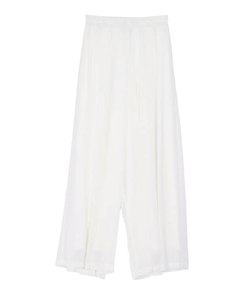 シースルー生地と中生地の着丈差を出し、足首が透けるデザインのトレンドのスカート見えするワイドパンツです。前後多めにタックを入れてボリュームの出るシルエットにしております。