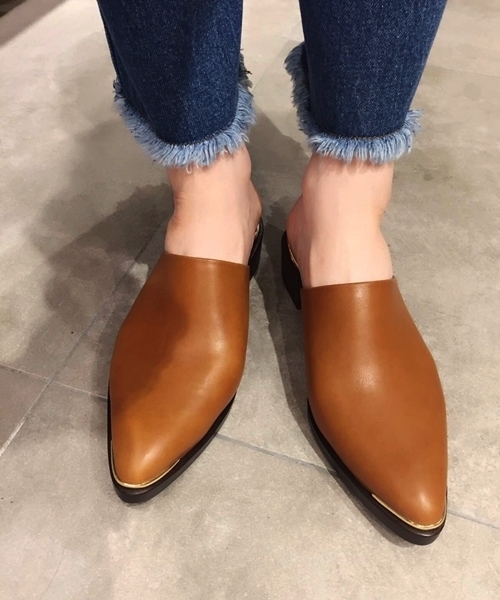 ミュールは今シーズン注目のアイテム。 シャープに履けるポインテッドトウと、フラットなデザインが足元に抜け感をプラスしてくれます。 つま先にはメタルパーツがモードな雰囲気もあり、カジュアル過ぎずに大人っぽく履いて頂ける1足です。 *店頭・外での撮影画像は、光の当たり具合で色味が違って見える場合があります。 商品の色味は、スタジオ撮影の画像をご参照ください。