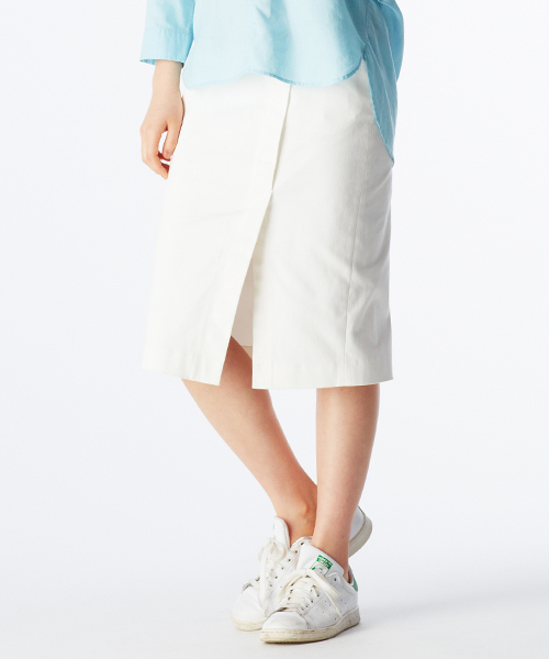 腰まわり、すっきりしなやか 新素材のIラインスカート 絶妙に計算された腰まわりの丸みと、新素材“ソロテックス【R】”のW効果で、らくちんきれいを実現する、才色兼備なペンシルスカート。使い勝手抜群のブラックとホワイトがスタンバイ。ひざを隠しつつ脚が細く見える絶妙なミディー丈が上品で、ほどよい厚みだからインナーラインが出にくく、透けにくいから安心。 ★デザインについて★ ウエストからヒップにかけてほんのり丸みをもたせているので、腰の張りを気にすることなく、ピタッとタイトになりすぎず、まっすぐきれいな絶妙Iラインのシルエットを実現します。 一見巻きスカートのように見えるトレンドのラップ風デザインに、脚さばきも抜群のスリットで大人美脚と抜群の脚さばきを。着映え感もアップ。 フロントはトップスインも美しく見えるすっきりとしたデザイン。 後ろはギャザーゴムでらくちん、すぽっとはけます。ヒップをきれいに見せてくれるダミーのポケットデザイン。 ウエストインしたときのポイントになるポケットのリベットは大人好みのゴールドで。 ★素材について★ 帝人フロンティアのSOLOTEX【R】と旭化成せんいのROICA【R】を組み合わせた「はきやすい」「らくちん」「美ラインキープ」の三拍子そろった最強ボトムスを生み出す、高機能ストレッチ素材です。 ※手洗い可 ★ペンシルスカートのコーディネイト提案★ 旬のワントーンコーデを、ヌーディーなベージュ&ホワイトで。トップスで丸みを加味したIラインのスカートスタイルなら、鮮度も好感度も抜群。笑顔が似合う凛とした女らしさを演出。 シャツやブラウス、カーディガンとコーディネートするとシンプルで大人っぽく、Tシャツやパーカーと組み合わせるとカジュアルに着こなせます。 足元はパンプスやブーティを合わせることで大人っぽく、白いスニーカーを合わせてヘルシーな装いにも。 アウターにはコートやジャケットを羽織りシンプルコーデに。